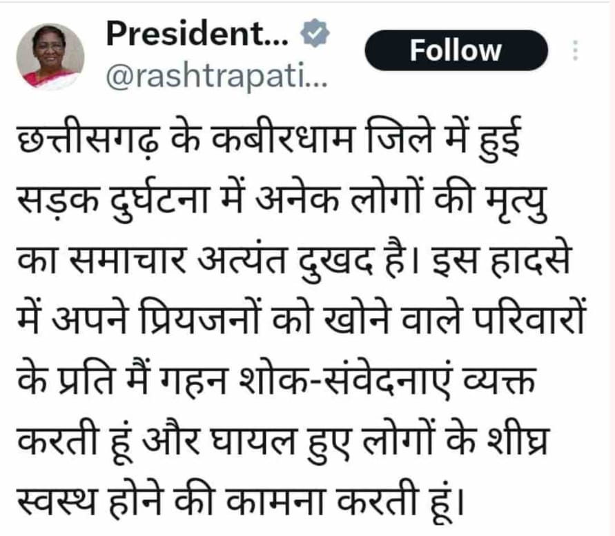 छत्तीसगढ़ के कबीरधाम जिले में बीते सोमवार को पिकअप के खाई में गिर जाने से 19 लोगों की जान चली गई I मृतकों में 18 महिलाएं और एक पुरुष हैं I सभी मृतक सेमरहा ग्राम के रहने वाले थे I इस पर प्रधानमंत्री नरेन्द्र मोदी और राष्ट्रपति द्रौपदी मुर्मू ने शोक जताया है I राष्ट्रपति मुर्मू ने कहा – ‘छत्तीसगढ़ के कबीरधाम जिले में हुई सड़क दुर्घटना में अनेक लोगों की मृत्यु का समाचार सुनकर अत्यंत दुःख है I इस हादसे में अपने प्रियजनों के खोने वाले परिवारों के प्रति मैं गहन शोक-सवेंदनाएं व्यक्त करती हूँ और घयाल लोगों की जल्द स्वस्थ होने की कामना करती हूँ I’