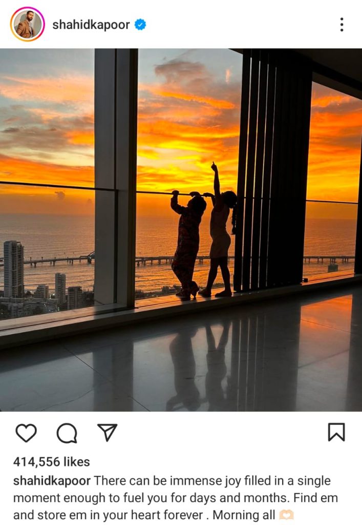 सभी बॉलीवुड स्टार अपने लुक, अपने सिग्नेचर स्टेप्स और लक्जरी लाइफस्टाइल के लिए हमेशा से चर्चाओं का विषय बने रहते हैं I अभिनेता शाहिद कपूर भी अपनी लक्जरी लाइफस्टाइल के लिए शुमार हैं I शाहिद ने कुछ समय पहले मुंबई में एक आलीशान घर ख़रीदा है जिसकी कुछ झलकियाँ सोशल मीडिया पर दिखाते रहते हैं I शाहिद कपूर इन दिनों सोशल मीडिया में काफी एक्टिव रहते हैं और अपने फैन्स को सरप्राइज करते हैं I शाहिद कपूर ने आज सुबह ही अपने इन्स्टाग्राम पर अपने घर से बच्चों की तस्वीर पोस्ट किया I जिसमें समंदर का खूबसूरत नजारा साफ़ देखा जा सकता है I शहीद कपूर के बच्चों के नाम जैन और मीशा है I शाहिद और कृति लास्ट बार “तेरी बातों में ऐसा उलझा जिया” में एक साथ दिखाई दिए थे I फिल्म गाने और उनके हुक स्टेप्स लोगों को खूब भाया था I शाहिद की आने वाली मूवी की बात करें तो अक्टूबर में “देवा” आने वाली है I